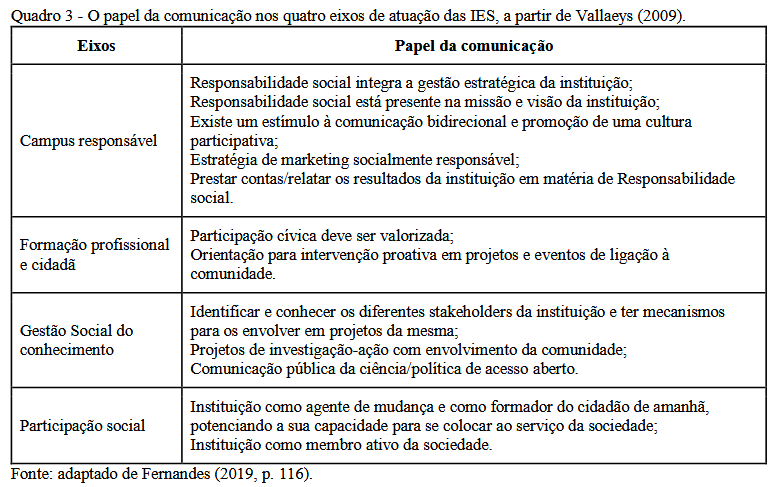 Devido às universidades serem sistemas abertos com vários stakeholders, a comunicação e a instituição (administração) devem estar alinhados e serem aspectos indissociáveis da gestão. No que concerne ao Desenvolvimento Sustentável (DS), a atuação pode se dar a partir dos variados eixos de atuação das IES. Esses eixos podem ser compreendidos como o tripé da universidade (ensino – formação; pesquisa – gestão social do conhecimento; extensão – participação social) junto a gestão (campus responsável).