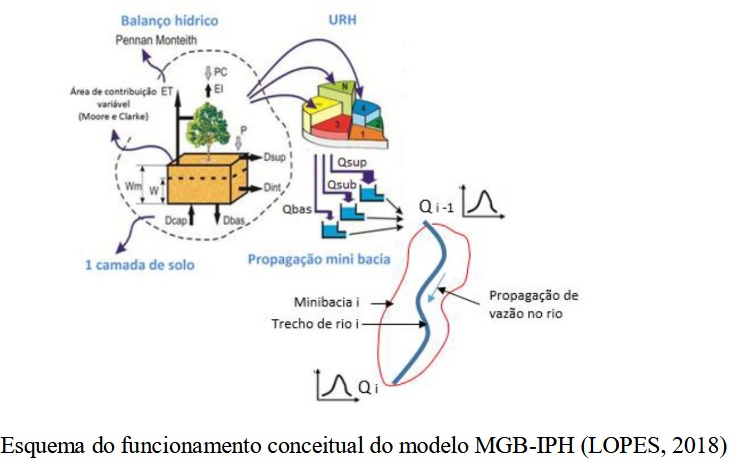 O Modelo de Grandes Bacias desenvolvido no Instituto de Pesquisas Hidráulicas da Universidade Federal do Rio Grande do Sul (MGB-IPH) é um importante modelo, já utilizado em diversas aplicações, inclusive para a avaliação de impactos de mudanças do clima. Permite a simulação hidrológica de bacias de grande escala, sendo adequado para a representação de bacias hidrográficas com área superior a 1.000 km².