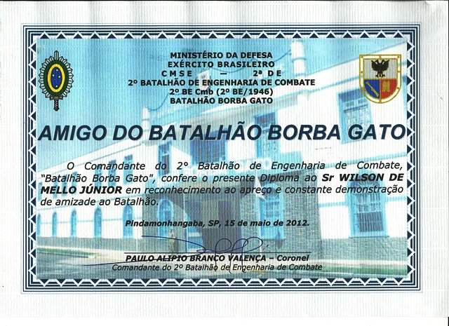 No úlimo dia 15 de maio de 2012 o 2° Batalhão de Combate de Engenharia - BATALHÃO BORBA GATO completou 66 anos de existência e nesta oportunidade o Diretor do Instiuto OPUS ,Wilson de Mello Jr recebeu o diploma de AMIGO DO BATALHÃO.