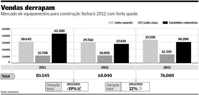 "Essas máquinas são destinadas a obras rodoviárias e foi desembolsado muito pouco recurso nessa área". O executivo atribui a redução nas vendas à desaceleração dos investimentos de infraestrutura no Brasil. Além da redução na execução orçamentária em obras PAC (Programa de Aceleração do Crescimento), obras rodoviárias e ferroviárias ficaram travadas após as denúncias de irregularidades no Departamento Nacional de Infraestrutura de Transportes (Dnit) e na estatal Valec, afirma Marques.