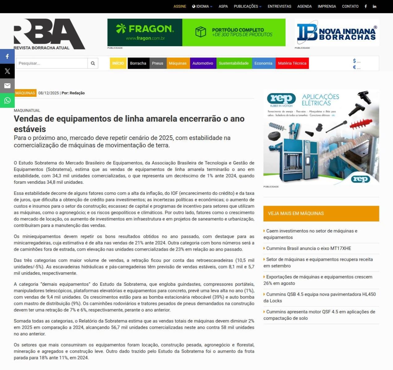 Borracha Atual - Vendas de equipamentos de linha amarela encerrarão o ano estáveis